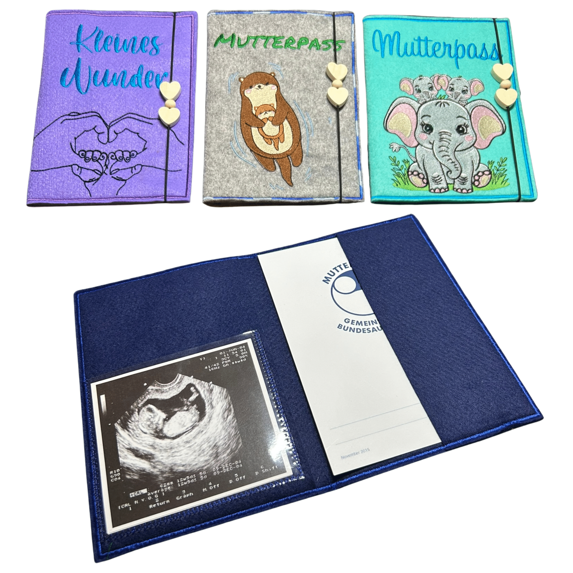 Hochwertige Mutterpasshülle aus Filz – liebevoll bestickt & individuell mit Namen oder Schriftzug personalisierbar. Inklusive Fach für Ultraschallbild – das perfekte Geschenk zur Schwangerschaft!