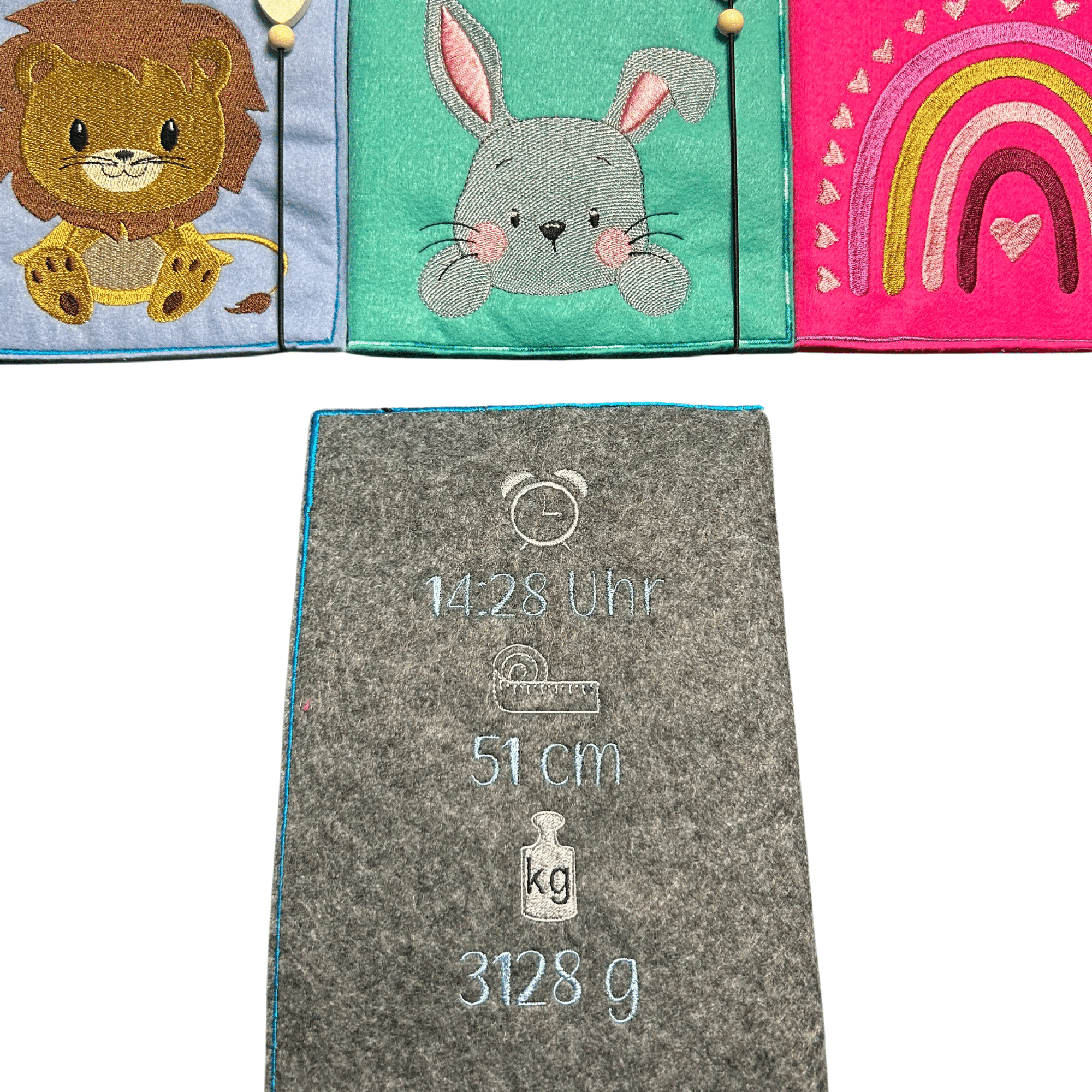 Damit deine Hülle so individuell wie dein Kind wird, hast du mehrere Gestaltungsmöglichkeiten. Du wählst nicht nur die Filzfarbe und das Wunschmotiv, sondern kannst auch den Namen und das Geburtsdatum aufsticken lassen. Falls du die Geburtsdaten auf die Rückseite sticken möchtest, kannst du dies beim Bestellvorgang einfach dazubuchen – die Schriftart „Kangen“ sorgt dabei für ein modernes, klares Schriftbild. Außerdem hast du die Wahl zwischen einfarbiger oder mehrfarbiger Randbestickung, was deiner Hülle einen besonderen, farblichen Akzent verleiht.