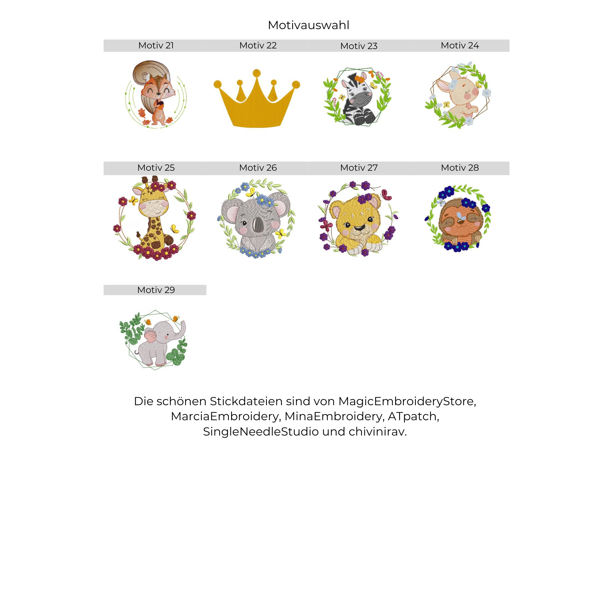 Die Farben der Stickmotive sind von uns harmonisch vordefiniert – solltest du dennoch spezielle Wünsche haben, sprich uns gerne an. Wir geben unser Bestes, deine Vorstellungen umzusetzen!